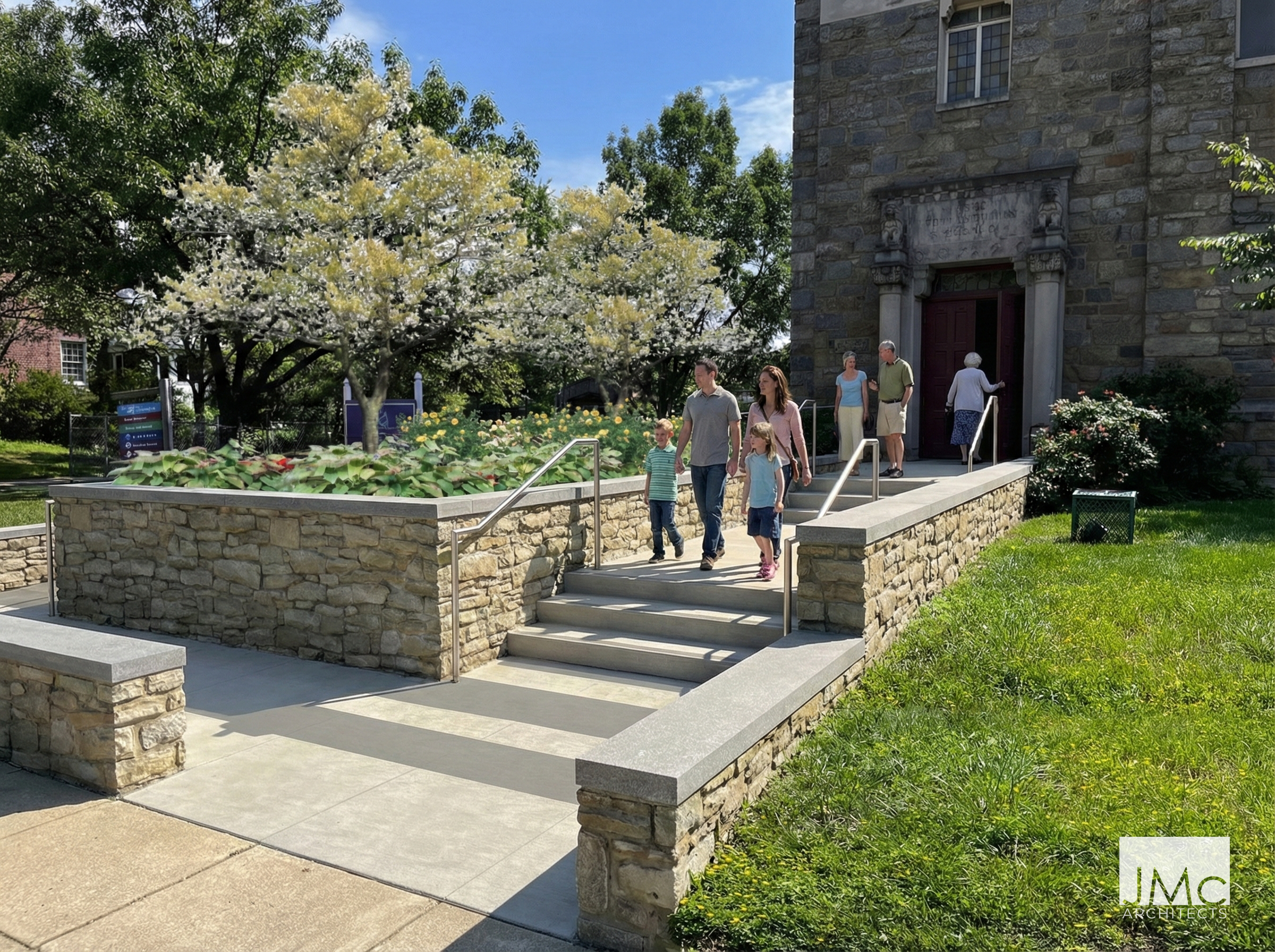 JMc Architects was engaged by this historic church in NW Washington, DC to evaluate their existing facilities and develop a concept design for exterior and interior improvements that would provide wheelchair accessible routes to their worship area and an interior ADA accessible toilet facility.